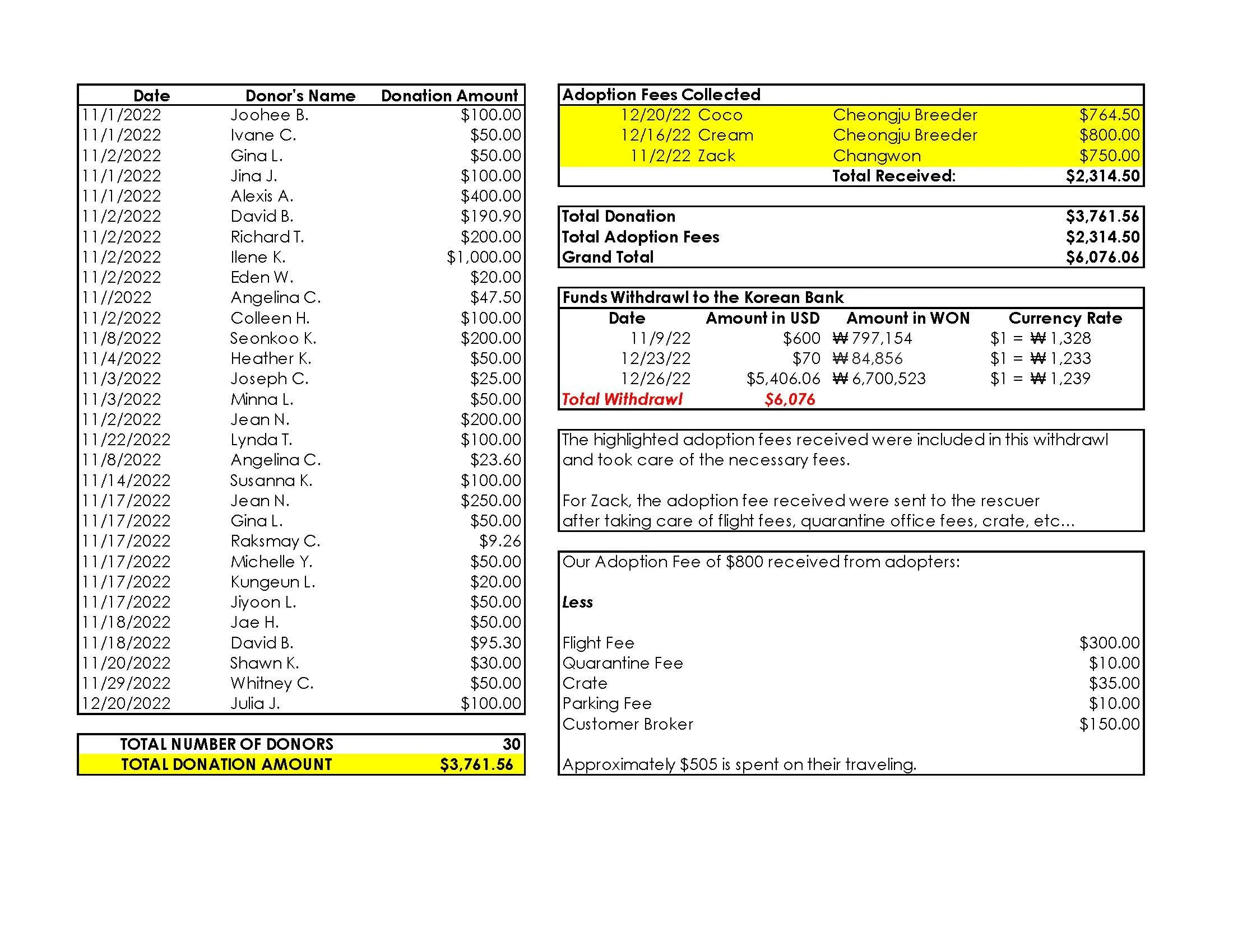 The total bill from Gen is 11,451,775 won ($9062.42 USD) less 855,200 won ($676.77 USD) Elsa, London, and Pudding’s bills, as they were paid separately by our rescuer as they’re not part of the Cheongju dogs. Below, please find the donations from the U.S: